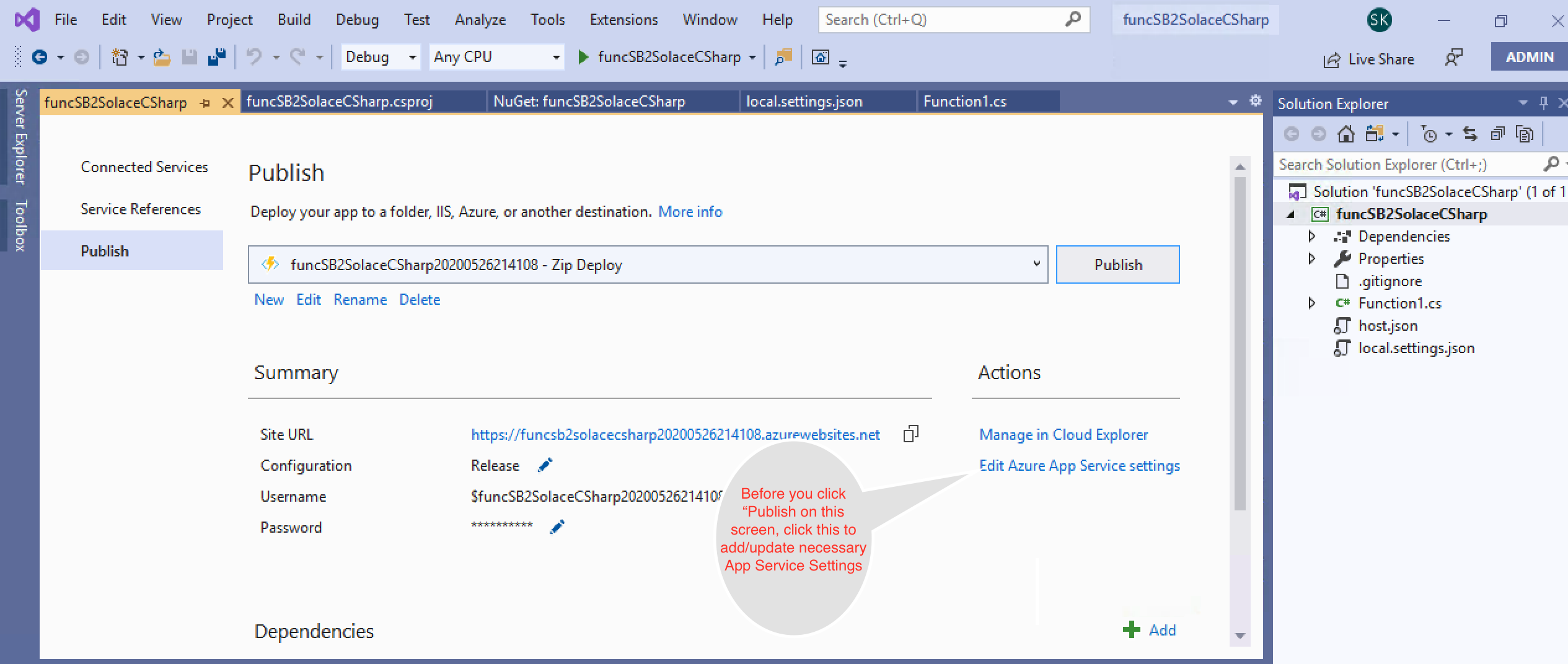 In the above screen you will do the following://Update the Service Bus end point connection string below "SBConnection": "Endpoint=....windows.net/;SharedAccessKeyName=ListenOnly;SharedAccessKey=xxxxxxxxxxxxxxxxxxxxxxx",